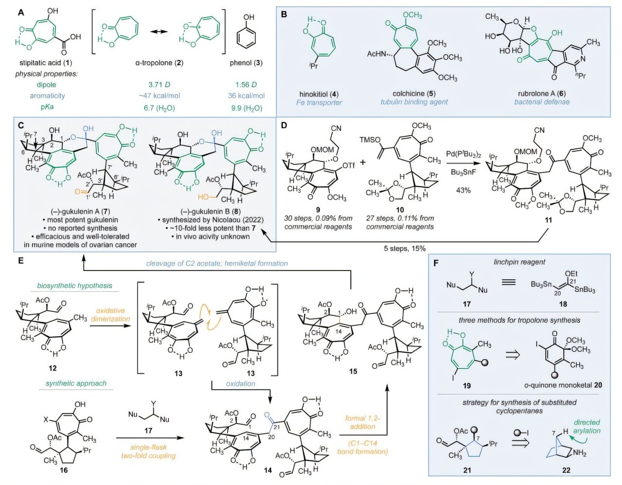 (–)-Gukulenin A is known to push chemists to their limits due to its challenging molecular motifs: two α-tropolones which are seven-membered aromatic rings with powerful molecular dipoles, 10 precise 3D stereocenters, and fragile chemical groups like a hemiketal and an aldehyde.