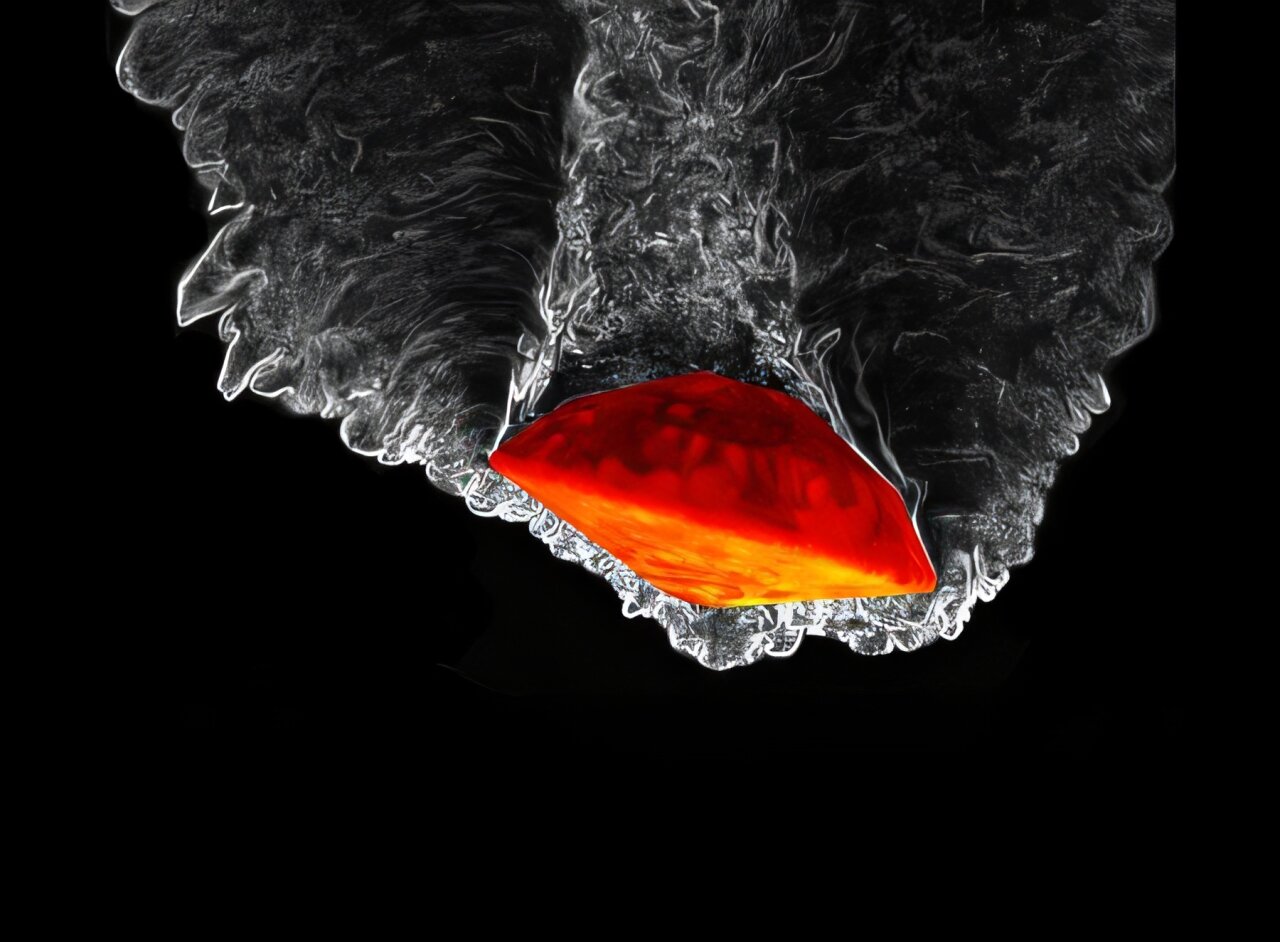 A high-fidelity simulation of the flow around the Mars Science Laboratory entry vehicle in the Martian atmosphere (data provided by Antón-Álvarez, A. and A. Lozano-Durán, Physical Review Fluids). The ray scale shading shows the magnitude of the vortex, while the red color map indicates the wall temperature. Yuan and Lozano-Durán’s new dimensionless learning framework was used to create a model that estimates surface heat flux for entry vehicles in this class. Credit: Antón-Álvarez, A. and A. Lozano-Durán, Physical Review Fluids